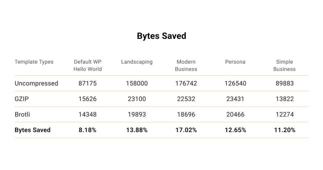 結果では、Brotliが毎回GZIPよりも多くのバイトを節約し、各ファイルをより効果的に圧縮できることが示されました。